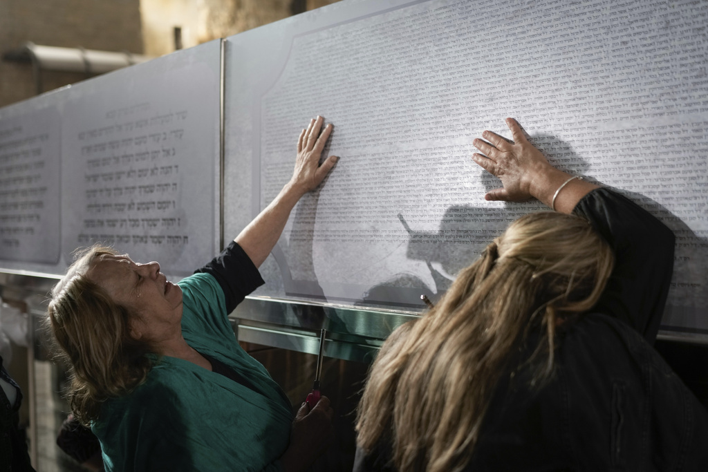 Όρθιος μπροστά από μια τεράστια ισραηλινή σημαία και το τείχος, ο επικεφαλής της χορωδίας των Ισραηλινών Αμυντικών Δυνάμεων Σάι ‘Αμπραμσον απήγγειλε μια προσευχή του εβραϊκού ταφικού τελετουργικού για τους ανθρώπους που χάθηκαν.