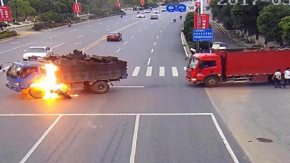 Ο μοτοσικλετιστής, δεν μπορεί να φρενάρει και καρφώνεται πάνω στο φορτηγό που διασχίζει το δρόμο.