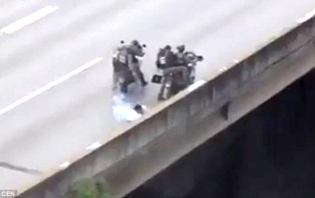Στις εικόνες διακρίνεται ο νεαρός περικυκλωμένος από αστυνομικούς, ένας εκ των οποίων εκτοξεύει καπνογόνο στο στήθος του και στη συνέχεια φεύγουν απ’ το σημείο.