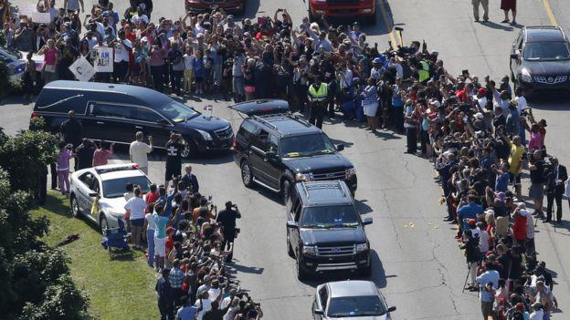 Εκατοντάδες άνθρωποι συγκεντρώθηκαν έξω από το σπίτι όπου μεγάλωσε ο Μοχάμεντ Άλι αλλά και κατά μήκος της διαδρομής που ακολούθησε η νεκρική πομπή του, στην πόλη Λούιβιλ, για να τιμήσουν τον πρωταθλητή που έφυγε την περασμένη εβδομάδα, σε ηλικία 74 ετών, μετά από μακρόχρονο αγώνα με τη νόσο του Πάρκινσον.