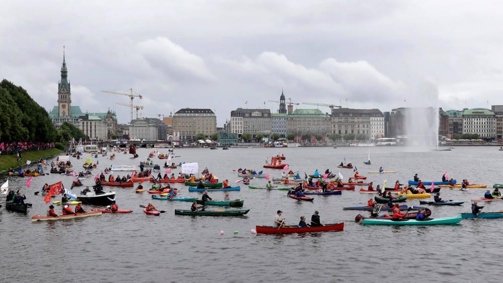 Παράλληλα διαδηλωτές σε κανό και μικρά πλεούμενα ανέβηκαν τον Άλστερ, τον ποταμό που διαρρέει το Αμβούργο.