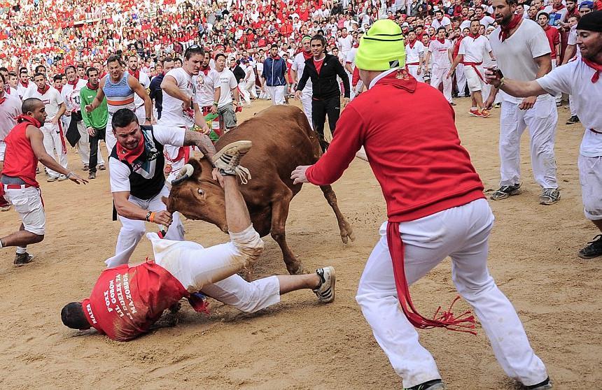 Στην ιδιαίτερη επικίνδυνη κούρσα με τους ταύρους στους δρόμους της πόλης, τρία άτομα δέχθηκαν σοβαρά χτυπήματα, με συνέπεια να μεταφερθούν αιμόφυρτοι και σε κρίσιμη κατάσταση στο νοσοκομείο.