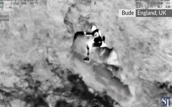 Στις εικόνες που καταγράφηκαν από την κάμερα ελικοπτέρου διακρίνεται ένας άνδρας να επιχειρεί να κρατηθεί πάνω σε έναν βράχο στην θάλασσα κοντά στο Μπάντε, σε απόσταση 321,87 χιλιομέτρων νοτιοδυτικά του Λονδίνου, έχοντας εγκλωβιστεί στο σημείο εξαιτίας της παλίρροιας, το Σάββατο το βράδυ.