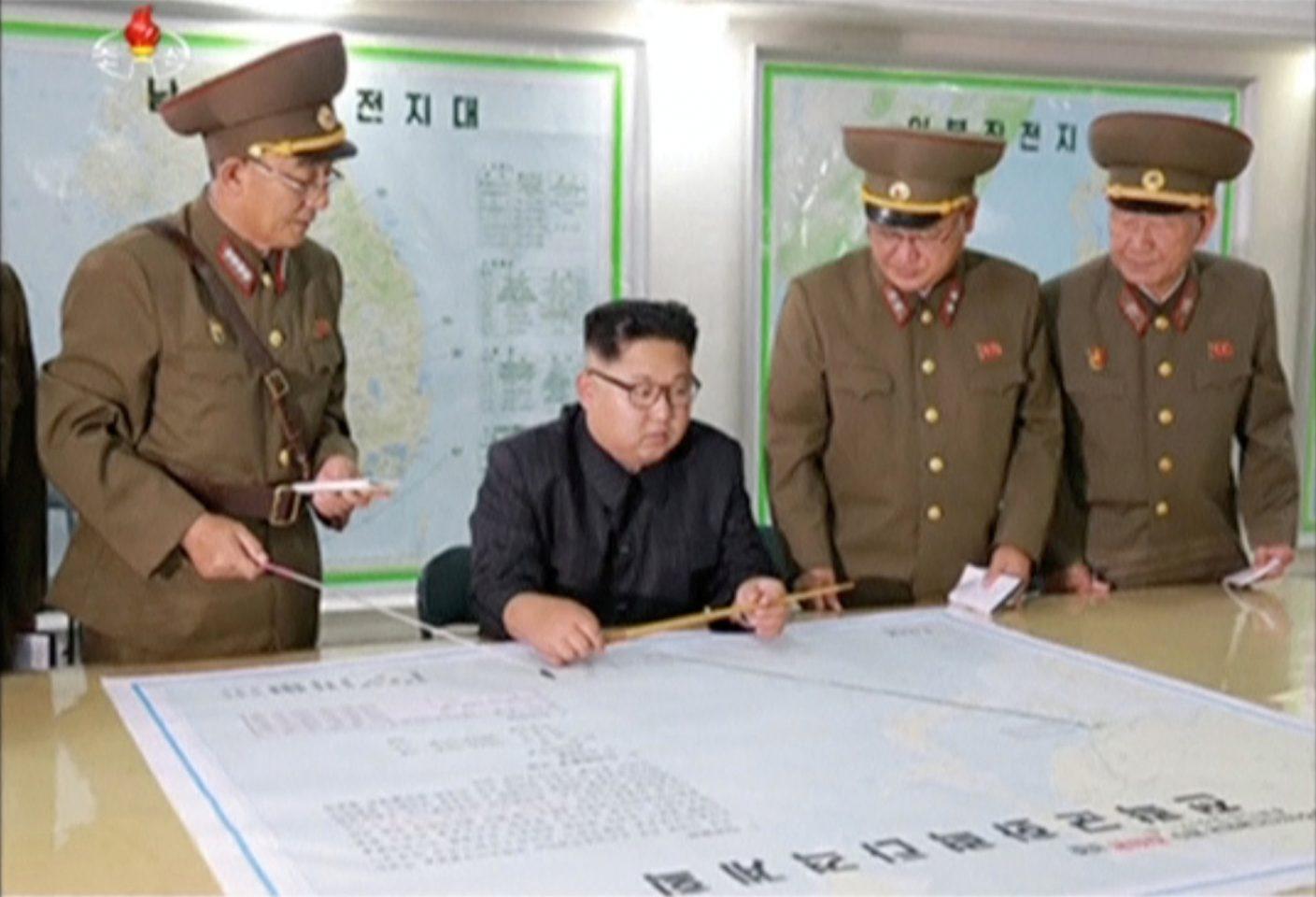 Στην πρώτη του δημόσια εμφάνιση μετά από δύο εβδομάδες, ο Κιμ επιθεώρησε τη διοίκηση του στρατού τη Δευτέρα, εξετάζοντας ένα σχέδιο εκτόξευσης τεσσάρων πυραύλων που έχουν στόχο να πέσουν κοντά στο Γκουάμ, στον Ειρηνικό, σύμφωνα με το επίσημο πρακτορείο KCNA.