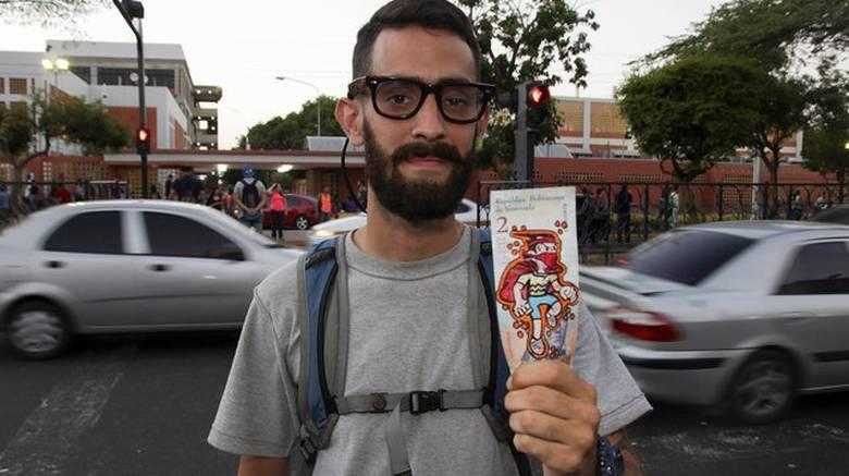 Ο Χοσέ Λεόν, 24 ετών, ζωγραφίζει τα πρόσωπα των εθνικών ηρώων της Βενεζουέλας που δεσπόζουν στα χαρτονομίσματα των δύο μπολίβαρ –τα οποία ισοδυναμούν με το 1/5 του αμερικανικού σεντς στην μαύρη αγορά συναλλάγματος– με τα πρόσωπα σούπερ ηρώων από την Αμερική.
