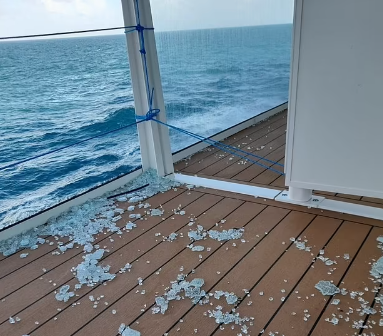 Η ίδια και ο σύζυγός της αποβιβάστηκαν περίπου στις 09:00 την Τρίτη και περιέγραψε ότι είδε εργάτες να αντικαθιστούν γυάλινες πόρτες, παράθυρα και χωρίσματα που είχαν σπάσει από την καταιγίδα.