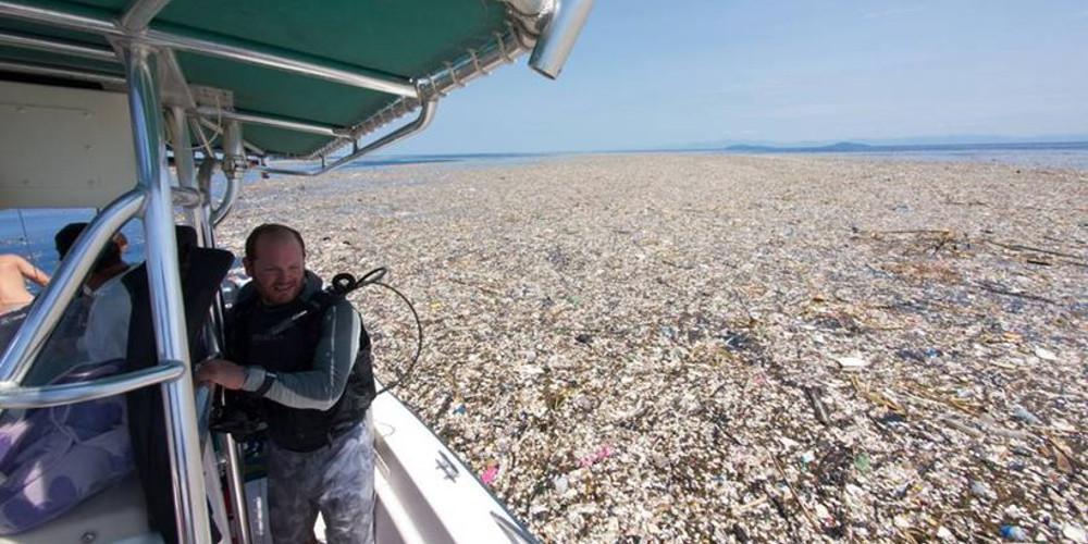 Η φωτογραφία τραβήχτηκε σε ένα κομμάτι θάλασσας κοντά σε ένα ήρεμο νησάκι της Καραϊβικής, όπου ούτε ίχνος γαλάζιου δεν διακρίνεται κάτω από την αχανή «κουβέρτα πλαστικού και φελιζόλ» που έχει σκεπάσει κάθε χιλιοστό του νερού.