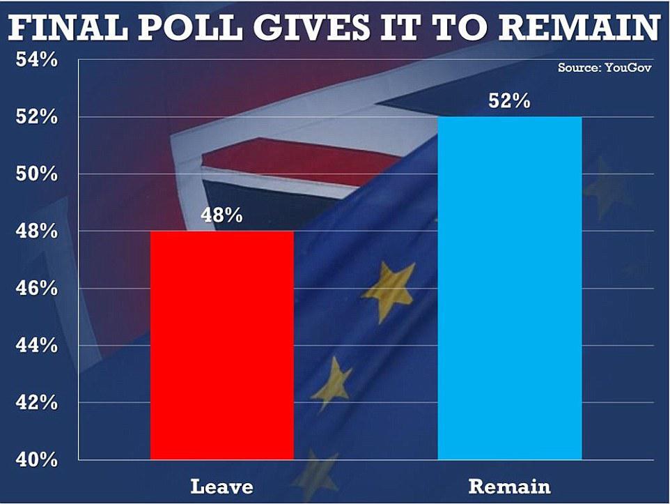 Η εκστρατεία υπέρ της παραμονής της Βρετανίας στην Ευρωπαϊκή Ένωση φαίνεται ότι προηγείται με 52%, ενώ η εκστρατεία υπέρ του Brexit συγκεντρώνει 48%, σύμφωνα με έρευνα της εταιρείας YouGov που διεξήχθη χθες, την ημέρα κατά την οποία διεξήχθη το δημοψήφισμα στο Ηνωμένο Βασίλειο, όπως μετέδωσε το βρετανικό τηλεοπτικό δίκτυο Sky News.