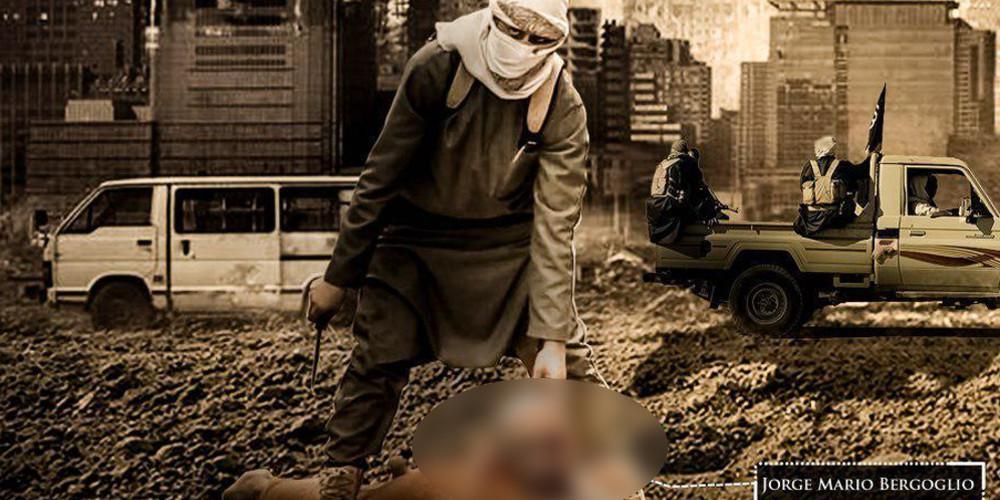 Στην αποκρουστική, προπαγανδιστική αφίσα διακρίνεται ένας τρομοκράτης ντυμένος στα χακί μ’ ένα λευκό μαντήλι να καλύπτει το πρόσωπό του κι ένα μαχαίρι στο δεξί χέρι να γέρνει πάνω από τη σορό ενός αιχμαλώτου και να αγγίζει το κομμένο κεφάλι του Προκαθήμενου της Ρωμαιοκαθολικής Εκκλησίας. Κάτω δεξιά αναγράφεται το όνομα του Ποντίφηκα: «Χόρχε Μάριο Μπεργκόλιο».