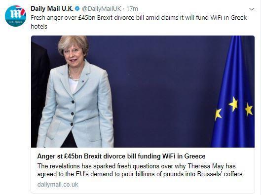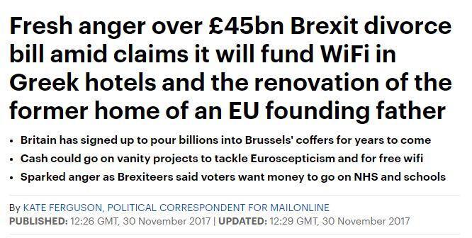 Στο δημοσίευμα, η οργή για το πολυδάπανο «διαζύγιο» Βρετανίας και Ευρωπαϊκής Ένωσης μεγαλώνει, καθώς υπάρχουν καταγγελίες ότι με αυτά τα χρήματα «θα χρηματοδοτήσουν WiFi σε ελληνικά ξενοδοχεία», καθώς και την ανακαίνιση ενός σπιτιού του Ζαν Μονέ, αρχιτέκτονα της ευρωπαϊκής ενοποίησης και «πατέρα» της Ευρωπαϊκής Ένωσης.