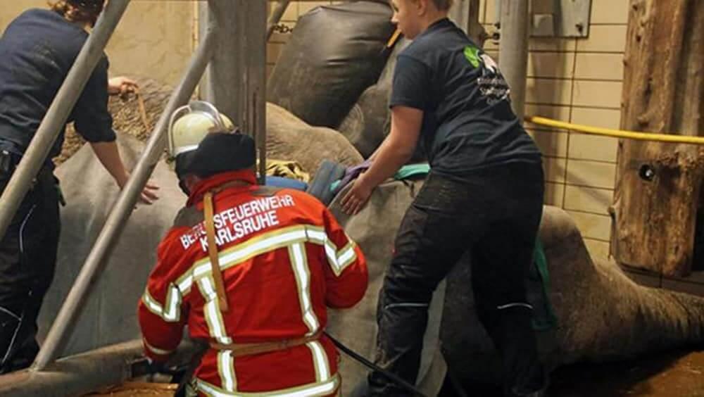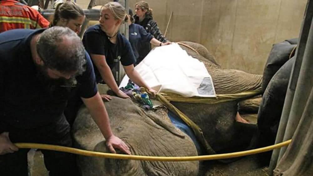 Το ζώο βρήκαν ξαπλωμένο χθες το πρωί οι φροντιστές και αμέσως σήμανε συναγερμός. Η ελεφαντίνα ηλικίας 45 ετών κινδύνευε από οργανική ανεπάρκεια επειδή ήταν ξαπλωμένη πολλές ώρες και το βάρος της φθάνει τους 3,5 τόνους.
