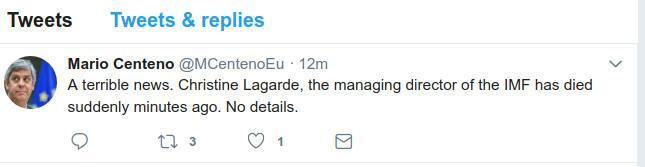 Ολα ξεκίνησαν με το μήνυμα «Η Κριστίν Λαγκάρντ μόλις μας άφησε».RIP. », το απόγευμα της Δευτέρας, 4 Δεκεμβρίου, στις 2 το μεσημέρι. Η φήμη πυρπόλησε κυριολεκτικά τα social media. Ενα νέο tweet κυκλοφόρησε μια ώρα αργότερα: «Πέθανε η Κριστίν Λαγκάρντ, οι συγγενείς της πολιτικού επιβεβαιώνουν». Για να δείξει μάλιστα ότι η είδηση είναι σωστή, το τελευταίο tweet συνοδευόταν με λινκ στο σάιτ Nécropédia (που διαβεβαίωνε, ωστόσο, ότι η Κριστίν Λαγκάρντ δεν πέθανε).