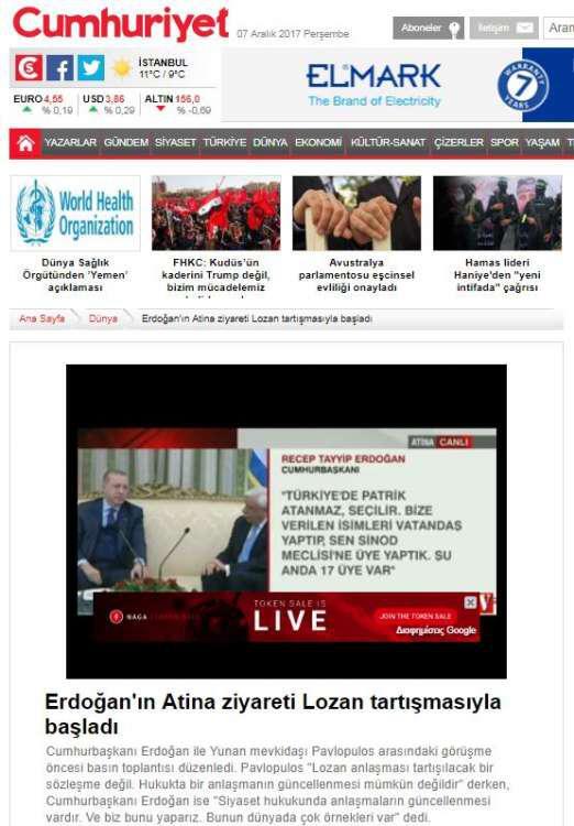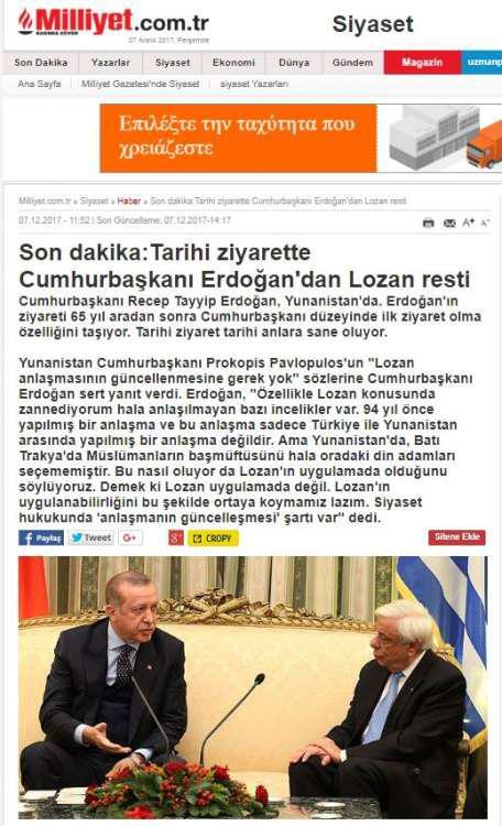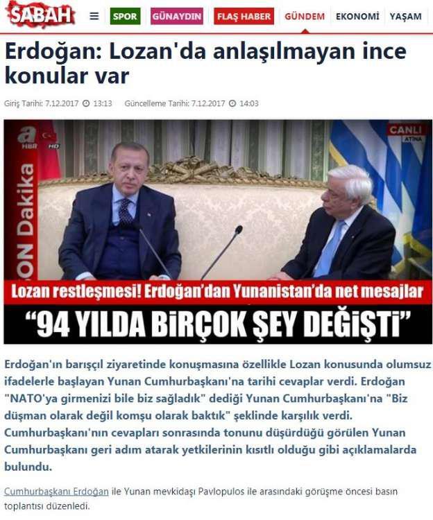 Ενδεικτικός ο τίτλος της Μιλιέτ: «Την προσοχή σας όλων, ακούστε παρακαλώ τι είπε ο Ερντογάν» με την τουρκική εφημερίδα να επισημαίνει ότι έθεσε το θέμα της συνθήκης της Λωζάνης.