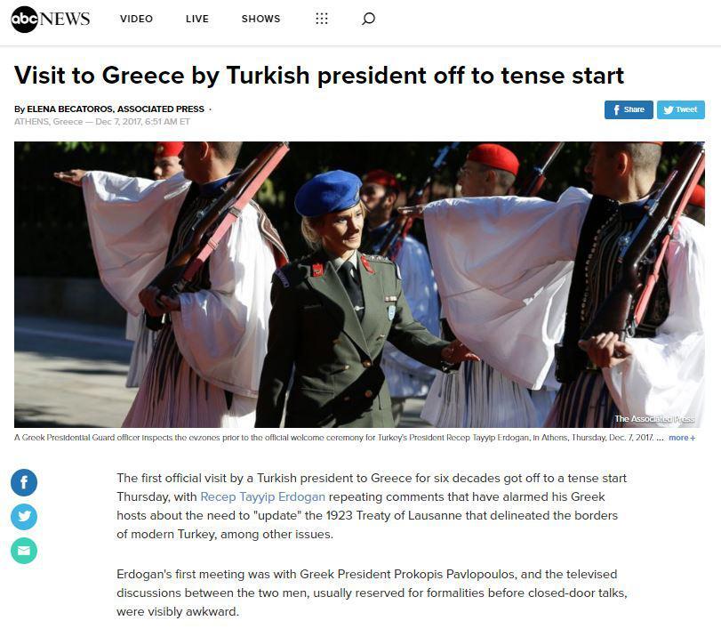 Mε ένταση ξεκίνησε η επίσκεψη Ερντογάν στην Αθήνα, σχολιάζει το αμερικανικό τηλεοπτικό δίκτυο ABC το οποίο σημειώνει ότι «οΡετζέπ Ταγίπ Ερντογάν επανέλαβε τα σχόλια που έχουν τρομάξει τους Έλληνες οικοδεσπότες για την ανάγκη “επικαιροποίησης” της Συνθήκης της Λωζάνης του 1923 που περιγράφει τα σύνορα της σύγχρονης Τουρκίας.