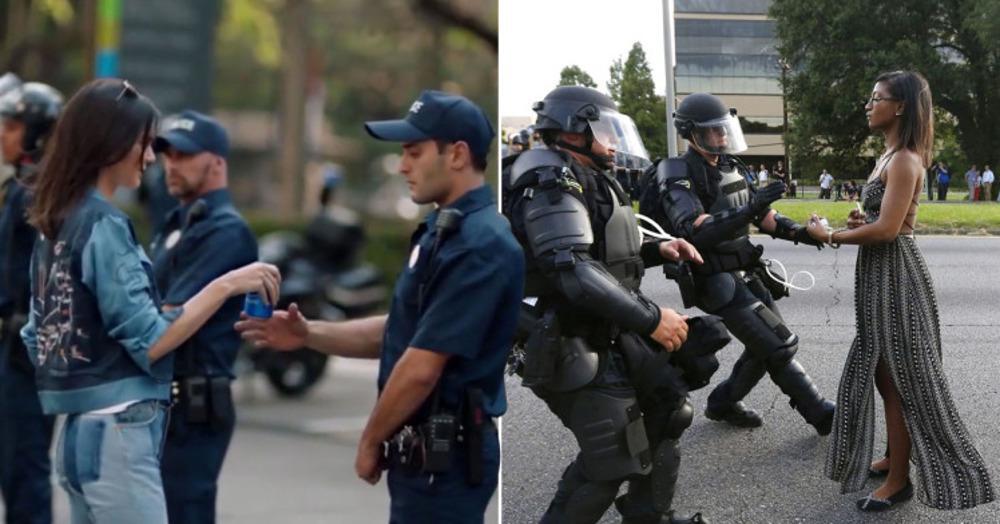 Το σημείο που η Τζένερ προσφέρει το αναψυκτικό στον αστυνομικό προκάλεσε έντονες αντιδράσεις καθώς αυτό θυμίζει το στιγμιότυπο που κυκλοφόρησε από την πορεία «Black Lives Matter», τότε που μία νεαρή γυναίκα στάθηκε ακίνητη μπροστά από τρεις πάνοπλους αστυνομικούς.