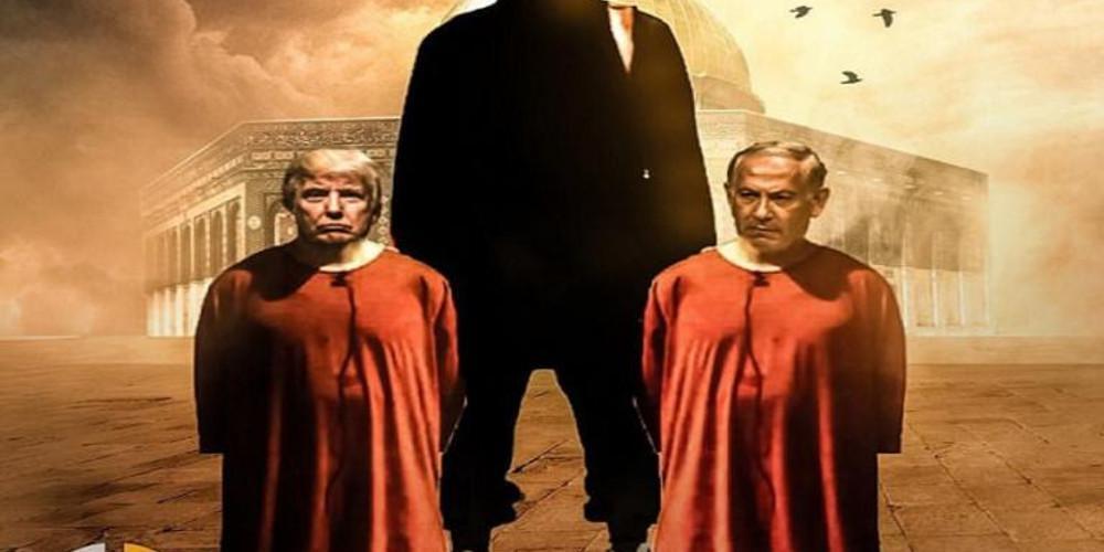 Στις νέες αφίσες απεικονίζονται ο Ντόναλντ Τραμπ και ο Μπενζαμίν Νετανιάχου ντυμένοι ως φυλακισμένοι να έχουν γονατίσει μπροστά σε τζιχαντιστή, έτοιμοι για εκτέλεση. Ο τόπος της αφίσας είναι το τζαμί Αλ Ακσα στην Ιερουσαλήμ, στο οποίο κυματίζει σημαία του Ισλαμικού Κράτους.