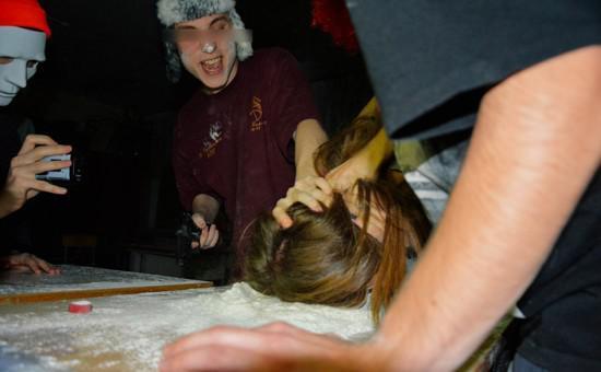 Οι μαθητές φαίνονται να απολαμβάνουν το πάρτι, ενώ σε άλλη φωτογραφία ορισμένοι από αυτούς βουτούν το κεφάλι ενός κοριτσιού μέσα σε μία λευκή σκόνη -αγνώστου ταυτότητος