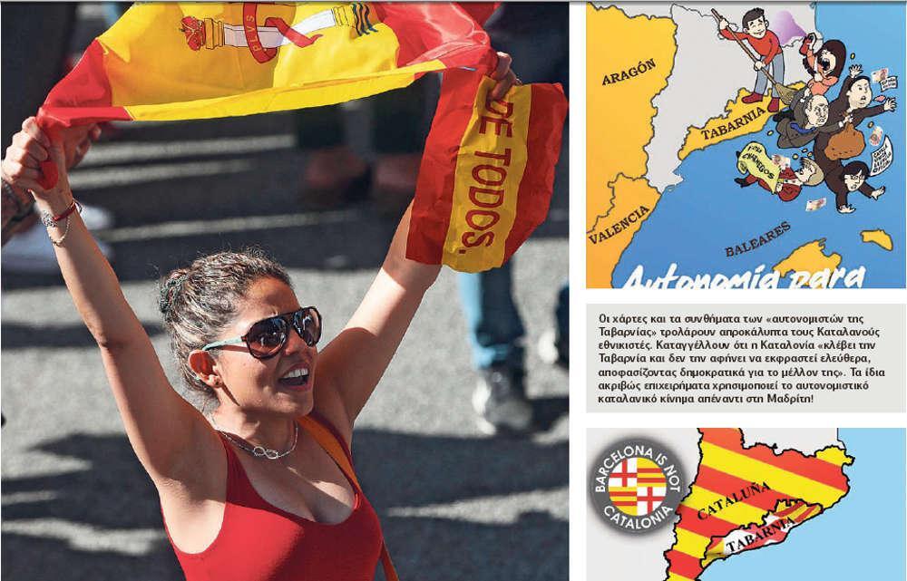 Τα δύο τελευταία 24ωρα έχει συγκεντρώσει πάνω από 25.000 υπογραφές στο Διαδίκτυο ένα ψήφισμα προς το ισπανικό Κοινοβούλιο, που ζητά «να ανακηρυχθεί η Ταβαρνία νέα αυτόνομη επαρχία της Ισπανίας, ανεξάρτητη από την Καταλονία». Παράλληλα ζητούν τη διεξαγωγή… δημοψηφίσματος απόσχισης από την Καταλονία τον Οκτώβριο του 2019!