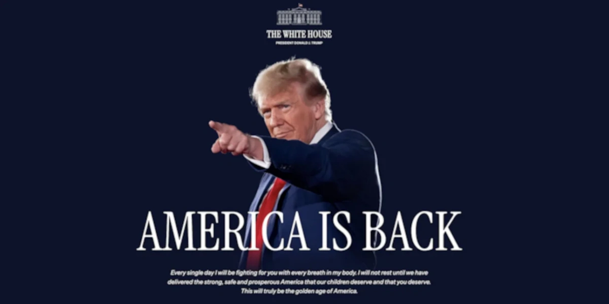 Λίγα λεπτά μετά από την ανάληψη των καθηκόντων του Τραμπ, ο επίσημος ιστότοπος του Λευκού Οίκου ενημερώθηκε με μια νέα αρχική σελίδα με την εικόνα του και το μήνυμα «Η Αμερική επέστρεψε». «Κάθε μέρα θα αγωνίζομαι για εσάς με κάθε αναπνοή του σώματός μου. Δεν θα ησυχάσω μέχρι να παραδώσουμε την ισχυρή, ασφαλή και ευημερούσα Αμερική που αξίζουν τα παιδιά μας και που αξίζετε εσείς. Αυτή θα είναι πραγματικά η χρυσή εποχή της Αμερικής», ανέφερε μια δήλωση κάτω από την εικόνα.