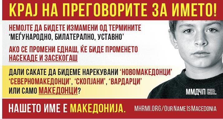 «Μην ξεγελιέστε από τους όρους “διεθνείς”, “διμερή” και “συνταγματική”. Εάν το όνομα της “Μακεδονίας” αλλάξει για οποιαδήποτε χρήση, θα αλλάξει παντού και για πάντα», αναφέρεται στη γιγαντοαφίσα.