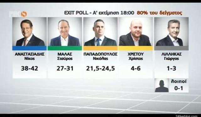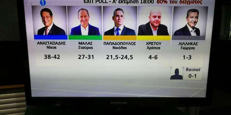 Σύμφωνα με τα exit poll των τηλεοπτικών σταθμών ο Σταύρος Μαλάς εμφανίζεται να έχει μικρό προβάδισμα έναντι του Νικόλα Παπαδόπουλου ενώ ο Πρόεδρος Αναστασιάδης εμφανίζεται πρώτος με ποσοστά κοντά σε αυτά που έδειχναν και οι δημοσκοπήσεις.