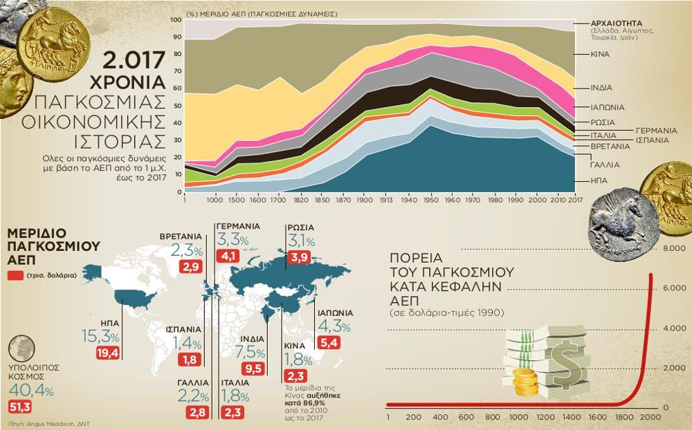 Με το ξέσπασμα της κρίσης το 2008 ένας αναλυτής της JP Morgan κι ένας διάσημος μελετητής της παγκόσμιας οικονομικής Ιστορίας συνδιαμόρφωσαν ένα γράφημα που παραπέμπει σε κυβιστικό πίνακα, αλλά στην πραγματικότητα συμπυκνώνει την οικονομική και πολιτική Ιστορία του κόσμου από τη γέννηση του Μεσσία έως τις μέρες μας. Επάνω σε δύο άξονες συντεταγμένων (ο κάθετος με το σύνολο του παγκόσμιου ΑΕΠ των μεγάλων δυνάμεων, ανεξαρτήτως εποχής και ο οριζόντιος με τη χρονολόγηση από το 1 έως το 2008 μ.Χ.) ο Μάικλ Σέμπαλιστ της JP Morgan και ο διάσημος οικονομικός ιστορικός Ανγκους Μάντισον κατέγραψαν τις διακυμάνσεις στην οικονομική ισχύ κάθε έθνους από τη ρωμαϊκή αρχαιότητα μέχρι σήμερα.