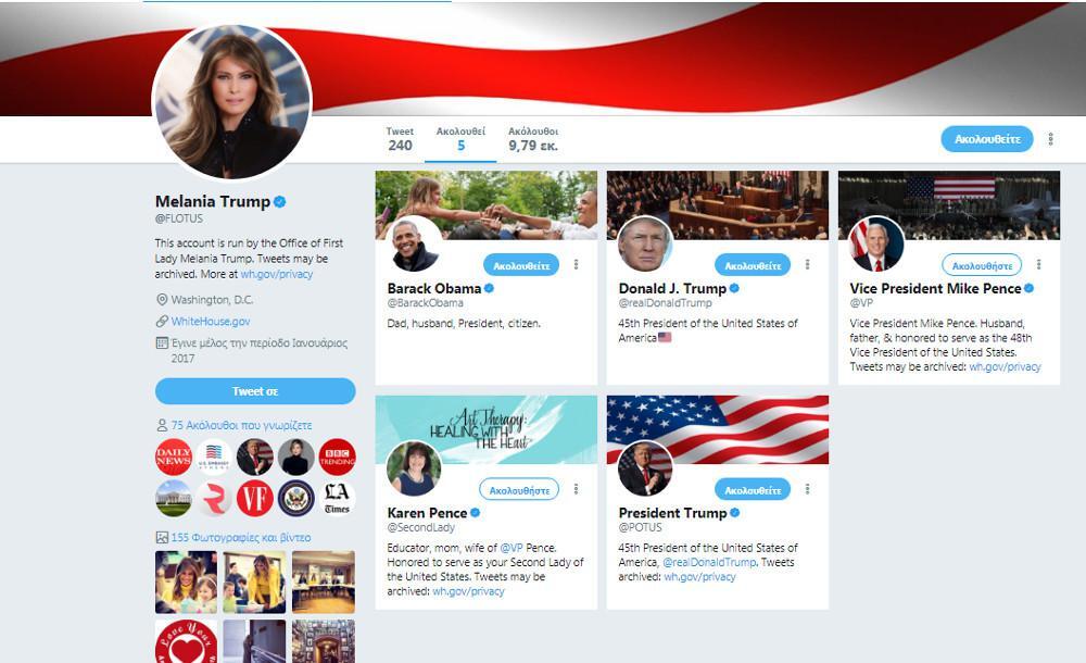 Πιο συγκεκριμένα, η Μελάνια ακολουθεί και τους δύο λογαριασμούς του συζύγου της, τον αντιπρόεδρο Μάικ Πενς και τη σύζυγό του Κάρεν, αλλά και τον τέως αμερικανό πρόεδρο, Ομπάμα.