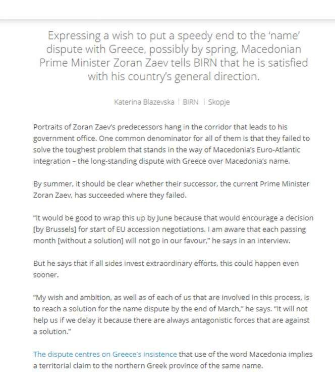 Ο κ. Ζάεφ δηλώνει ακόμη πεπεισμένος για τις «καλές προθέσεις» τόσο του πρωθυπουργού Αλέξη Τσίπρα όσο και του υπουργού Εξωτερικών Νίκου Κοτζιά, σημειώνοντας ότι ο πρώτος «θέλει πραγματικά να βρεθεί λύση» και ο δεύτερος «κάνει κι εκείνος προσπάθεια. Θα ήταν καλό να έχουμε λήξει το ζήτημα μέχρι τον Ιούνιο, γιατί κάτι τέτοιο θα ενθαρρύνει τις Βρυξέλλες να εγκρίνουν την έναρξη των ενταξιακών μας διαπραγματεύσεων με την Ευρωπαϊκή Ένωση, κάθε μήνας που περνά χωρίς λύση δεν είναι προς το συμφέρον μας», τονίζει ο επικεφαλής της κυβέρνησης των Σκοπίων και συνεχίζει λέγοντας πως «διατηρώ το ίδιο αίσθημα που με καθοδηγούσε από την αρχή – δηλαδή ότι μια λύση είναι εφικτή. Την ίδια στιγμή όμως, παραμένουν πεπεισμένοι ότι η λύση πρέπει να προστατεύει την ταυτότητα και την αξιοπρέπεια και των δύο πλευρών», υπογραμμίζει.