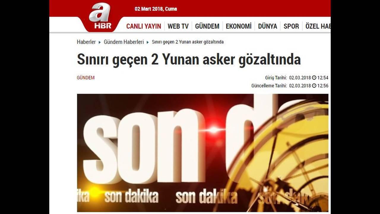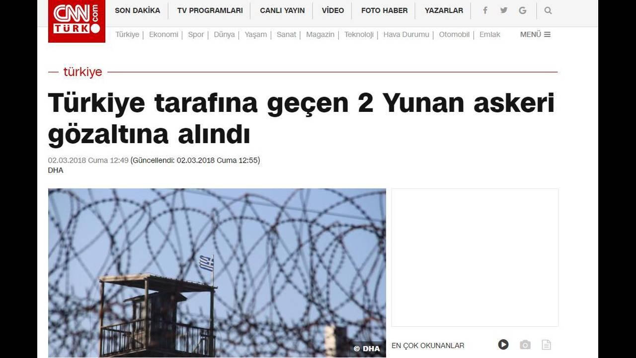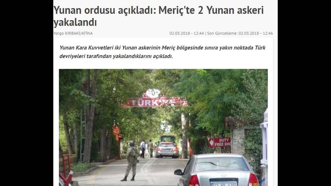 «Συνελήφθησαν δύο Έλληνες στρατιώτες στον Έβρο», αναφέρει η ιστοσελίδα της Hurriyet που παραθέτει την ανακοίνωση του Γενικού Επιτελείου Στρατού της Ελλάδας σχετικά με την υπόθεση, τονίζοντας πως οι στρατιωτικοί χάθηκαν λόγω της κακοκαιρίας.