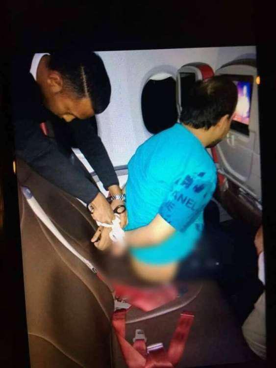 Ξεγυμνώθηκε στη διάρκεια της πτήσης, έβλεπε πορνό στο κινητό του και επιτέθηκε σε αεροσυνοδό. Οπως ήταν φυσικό η συμπεριφορά του προκάλεσε την αντίδραση επιβατών και αεροσυνοδών με αποτέλεσμα τη σύλληψή του.