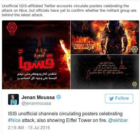 Υποστηρικτές της οργάνωσης Ισλαμικό Κράτος (ΙΚ) πανηγυρίζουν σε αναρτήσεις τους σε ιστοτόπους κοινωνικής δικτύωσης για την πολύνεκρη επίθεση στη Νίκαια, όπου ένα φορτηγό έπεσε πάνω σε πλήθος ανθρώπων που είχαν συγκεντρωθεί για να δουν την εκτόξευση πυροτεχνημάτων το βράδυ της εθνικής εορτής της Γαλλίας, με αποτέλεσμα να χάσουν τη ζωή τους τουλάχιστον 75 άνθρωποι και να τραυματιστούν τουλάχιστον 100 άλλοι.