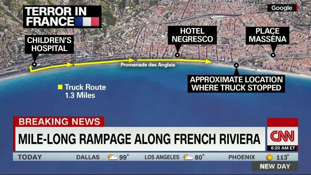 Ο οδηγός του λευκού φορτηγού πάτησε γκάζι και «θέρισε» τους εκατοντάδες ανθρώπους που παρακολουθούσαν το σόου των πυροτεχνημάτων, με την φημισμένη Προμενάντ ντεζ Ανγκλέ να μετατρέπεται σε ένα απέραντο «σφαγείο».