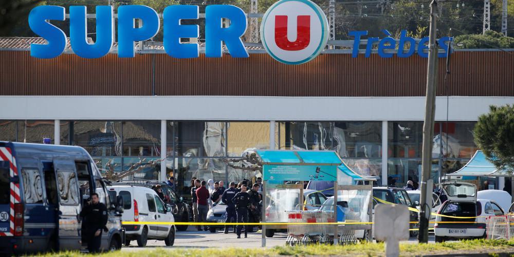 Δύο άνθρωποι έχασαν τη ζωή τους μέσα στο σουπερμάρκετ. Λίγο νωρίτερα ο δράστης, ο 26χρονος Ρεντουάν Λακντίμ, είχε σκοτώσει άλλον έναν στη γειτονική πόλη Καρκασόν, για να του κλέψει το αυτοκίνητο. Στη συνέχεια εντόπισε τέσσερις αστυνομικούς που έκαναν τζόγκινγκ στην πόλη, άνοιξε πυρ και τραυμάτισε έναν από αυτούς στον ώμο. Ανέπτυξε ταχύτητα και εξαφανίστηκε, για να φτάσει λίγα λεπτά αργότερα στην Τρεμπ που απέχει μόλις 8 χιλιόμετρα.