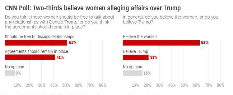 Τα ποσοστά της δημοτικότητας του Τραμπ είχαν διακυμάνσεις στις τέσσερις πρόσφατες δημοσκοπήσεις που πραγματοποίησε το CNN, καθώς καταγράφηκαν στο 35% τον Δεκέμβριο, στο 40% τον Ιανουάριο, στο 35% τον Φεβρουάριο και στο 42% στη νέα δημοσκόπηση. Αναφορικά με την ουσία του ποσοστού αποδοχής, το ποσοστό αυτών που δυναμικά εγκρίνουν την προεδρία Τραμπ καταγράφηκε στο 28% στη νέα δημοσκόπηση, ενώ το ποσοστό όσων αποδοκιμάζουν τον τρόπο άσκησης της προεδρίας του καταγράφηκε στο 46%, παραμένοντας σχετικά σταθερό σε όλη την περίοδο των παραπάνω μηνών. Έτσι, η ταλάντευση αυτή πηγάζει κυρίως από προτιμήσεις που έχουν περιστασιακό χαρακτήρα.