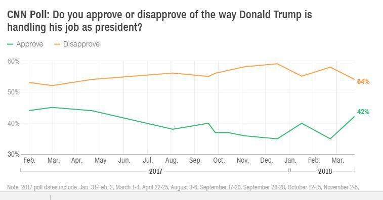 Όπως προκύπτει τα ποσοστά αποδοχής του Ντόναλντ Τραμπ σύμφωνα με τα δημοσκοπικά στοιχεία του CNN φτάνει το 42%, 7 μονάδες μεγαλύτερο συγκριτικά με τα αντίστοιχα νούμερα του Φεβρουαρίου.