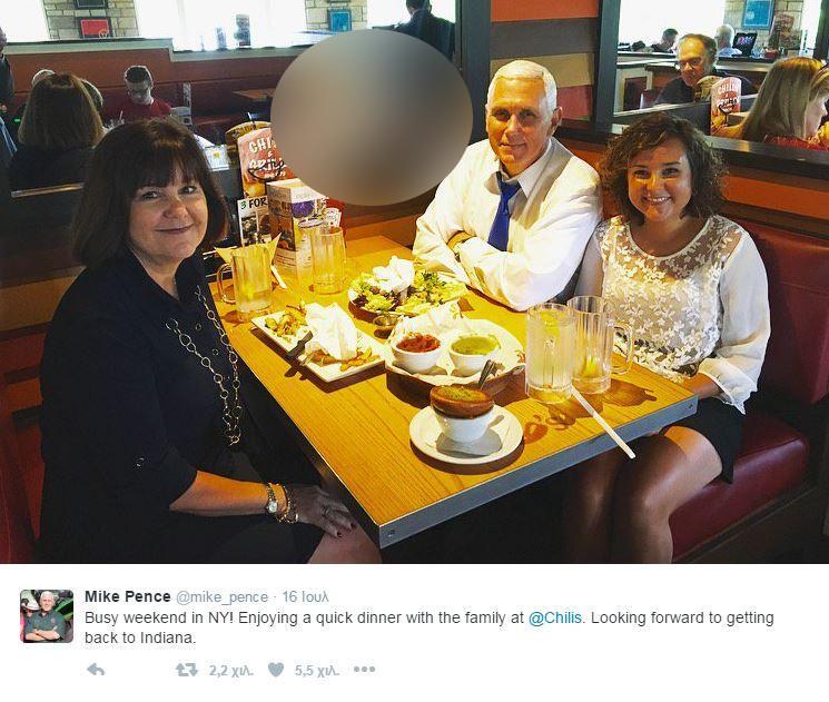 Στη φωτογραφία που ανέβασε ο Μάικ Πενς στον προσωπικό του λογαριασμό στο twitter εμφανίζεται να τρώει σε ένα εστιατόριο μαζί με τη γυναίκα και την κόρη του.