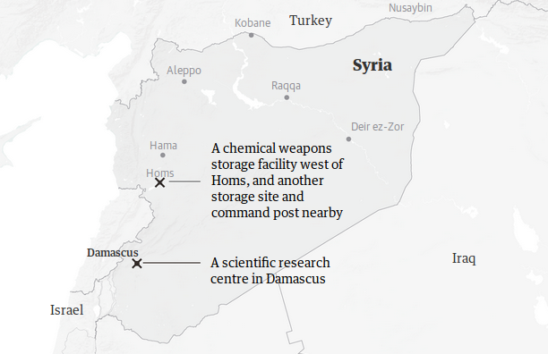 Στόχος των βομβαρδισμών «ακριβείας» είναι θέσεις που σχετίζονται με τις «χημικές οπλικές δυνατότητες» του καθεστώτος Άσαντ, δήλωσε ο αμερικανός πρόεδρος Ντόναλντ Τραμπ. Έως τώρα έχει γίνει γνωστό πως επλήγησαν ένα ερευνητικό κέντρο στην πρωτεύουσα Δαμασκό, όπου νωρίτερα ακούστηκαν εκρήξεις, και τουλάχιστον δύο στρατιωτικές αποθήκες κοντά στην πόλη Χομς.