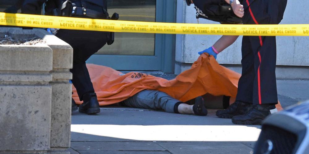 Ο 42χρονος άνδρας βλέπει τότε τραυματίες στο έδαφος: «Τους έκαναν μαλάξεις. Δύο από αυτούς πέθαναν εκεί, μπροστά στα μάτια μου». Δείχνει με το δάκτυλο δύο πτώματα, που δύο ώρες αργότερα συνεχίζουν να βρίσκονται στο πεζοδρόμιο, σκεπασμένα με πορτοκαλί σεντόνια κάτω από τον ανοιξιάτικο ήλιο της οικονομικής πρωτεύουσας του Καναδά.