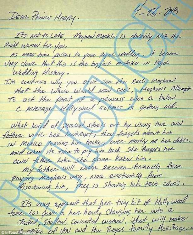 «Όσο περνάει ο καιρός και πλησιάζει ο βασιλικός γάμος, γίνεται περισσότερο ξεκάθαρο ότι αυτό είναι το μεγαλύτερο λάθος στην ιστορία των βασιλικών γάμων. Η Μέγκαν Μαρκλ είναι προφανές ότι δεν είναι η σωστή γυναίκα για εσάς. Είμαι μπερδεμένος πως δεν βλέπετε την αληθινή Μέγκαν, την οποία βλέπει πλέον όλος ο κόσμος. Η προσπάθεια της να υποδυθεί την πριγκίπισσα, όπως μια ηθοποιός του Χόλιγουντ κάτω από τον μέσο όρο, έχει κουράσει.