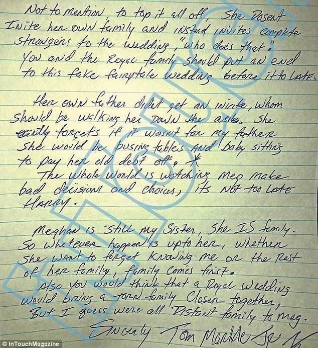 Και αποκορύφωμα όλων, ότι δεν καλεί την ίδια της την οικογένεια και αντ’αυτού καλεί εντελώς αγνώστους στον γάμο. Ποιος το κάνει αυτό; Εσύ και η βασιλική οικογένεια πρέπει να βάλετε ένα τέλος σε αυτόν τον ψεύτικο παραμυθένιο γάμο πριν να είναι πολύ αργά. Η Μέγκαν είναι η αδελφή μου. Είναι οικογένεια. Συνεπώς, ότι συμβεί εξαρτάται από την ίδια, είτε επιλέξει να ξεχάσει εμένα ή όλη την οικογένεια, ανεξαρτήτως η οικογένεια πάντα έρχεται πρώτη».
