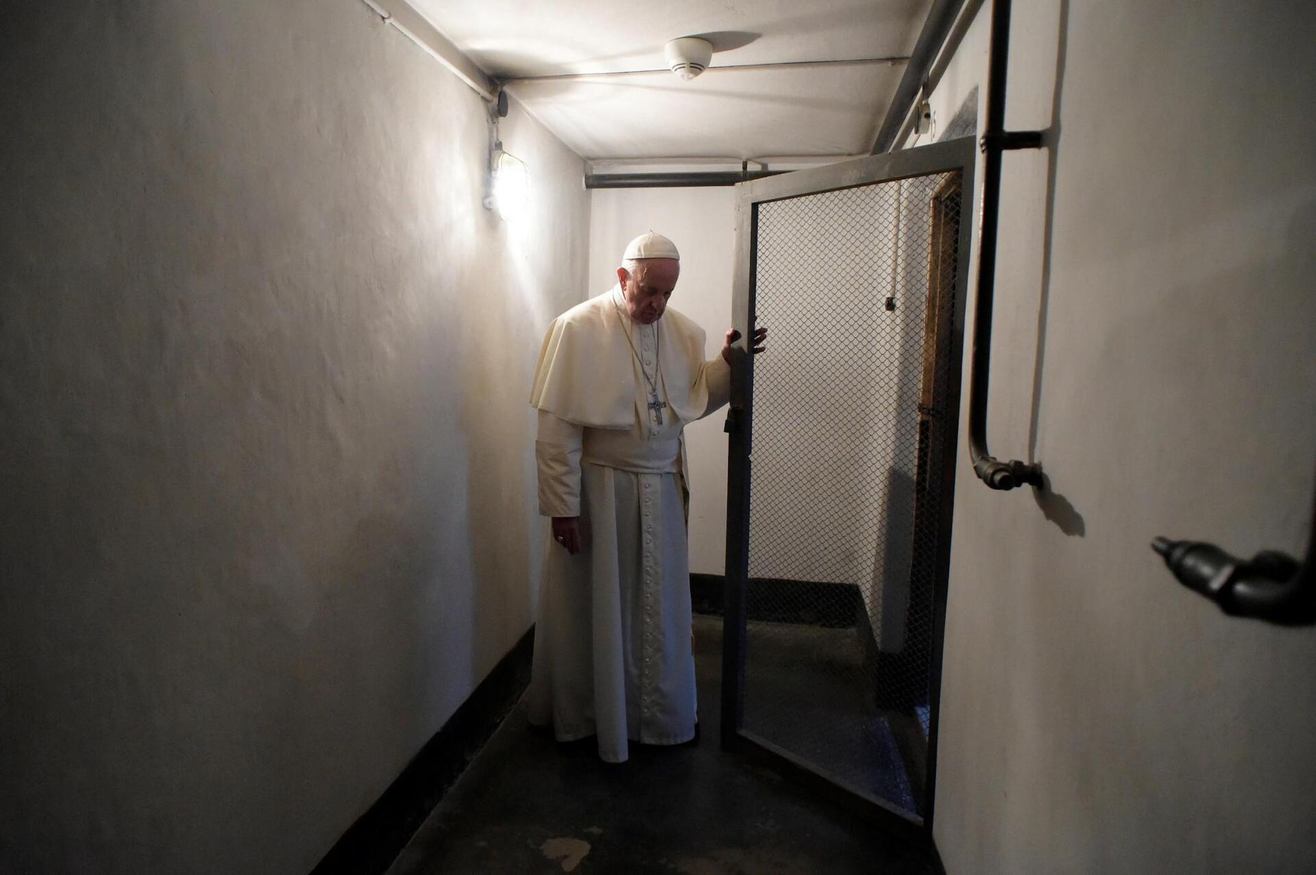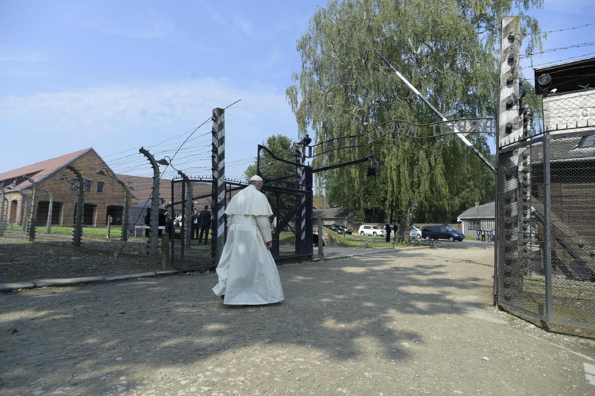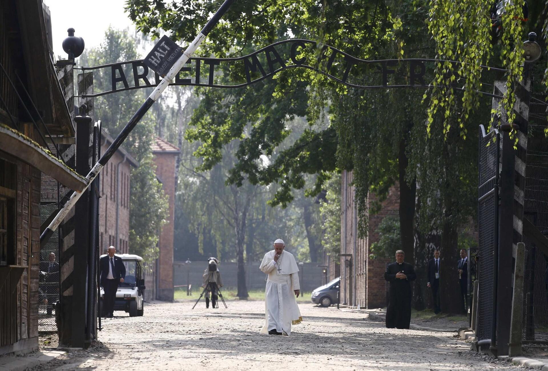 Μόνος, βυθισμένος στις σκέψεις του, ο ποντίφικας διέσχισε πεζός την πύλη του Άουσβιτς, με τη διαβόητη επιγραφή “Arbeit macht frei” (“Η δουλειά απελευθερώνει”).