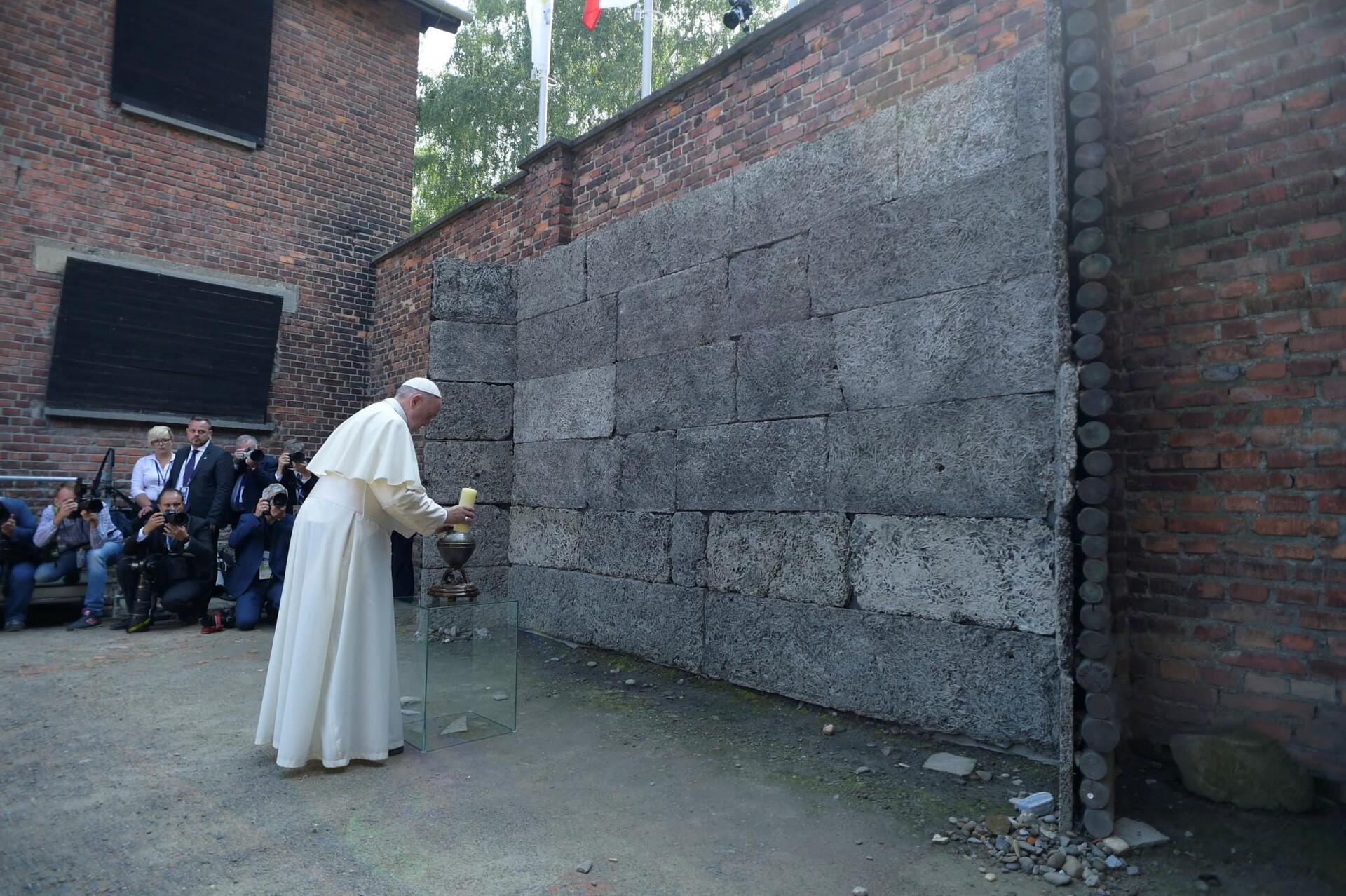Ένα ηλεκτροκίνητο αυτοκίνητο τον μετέφερε κατόπιν κοντά στον Τοίχο του θανάτου, όπου οι Ναζί εκτέλεσαν χιλιάδες κρατούμενους με μια σφαίρα στο κεφάλι. Εκεί τον περίμενε μια ομάδα ηλικιωμένων: δώδεκα άνθρωποι που σώθηκαν από το Άουσβιτς, Πολωνοί, Εβραίοι και Ρομά, μεταξύ των οποίων και η βιολίστρια της ορχήστρας του στρατοπέδου, η Ελένα Ντούνιτς-Νιβίνσκα, 101 ετών. Ο πάπας συνομίλησε με όλους για λίγα λεπτά και άναψε μια λαμπάδα μπροστά στον Τοίχο, τον οποίο άγγιξε με το χέρι του.