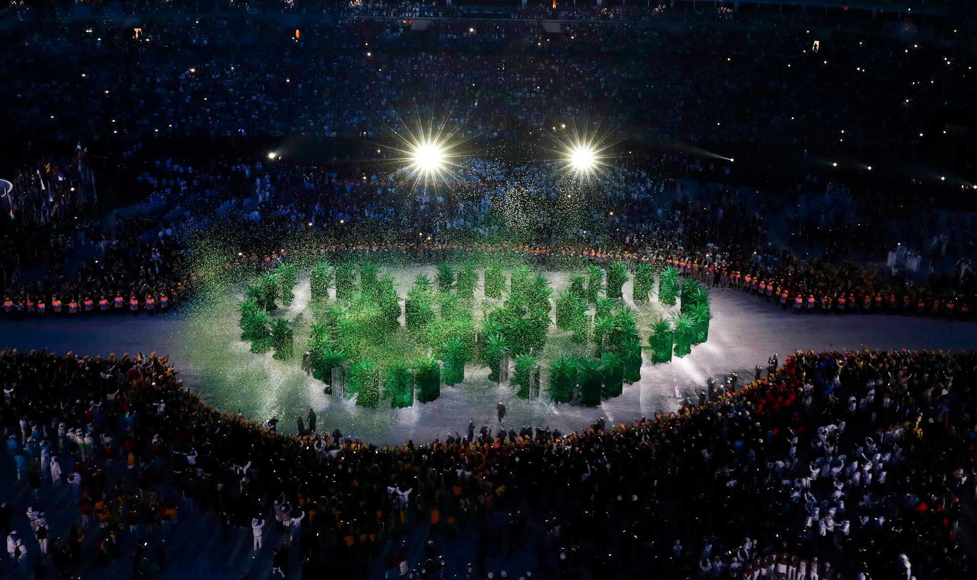 Και οι εκπλήξεις των Βραζιλιάνων δεν είχαν τελειώσει. Οι σπόροι που λίγο νωρίτερα είχαν φυτέψει στα ειδικά φιαλίδια οι αθλητές που συμμετείχαν στην παρέλαση, μετατράπηκαν σε δένδρα, σχηματίζοντας με περίτεχνο τρόπο τους Ολυμπιακούς Κύκλους στη μέση του σταδίου.
