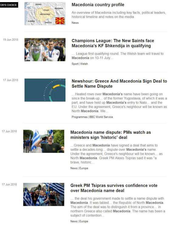 Μία απλή περιήγηση στο site του BBC αρκεί για να δει κανείς πως στην αναζήτηση δεδομένων η πΓΔΜ συνεχίζει να εμφανίζεται ως σκέτο «Μακεδονία» από τις 17 Ιουνίου και ύστερα, όταν δηλαδή υπεγράφη και η συμφωνία.