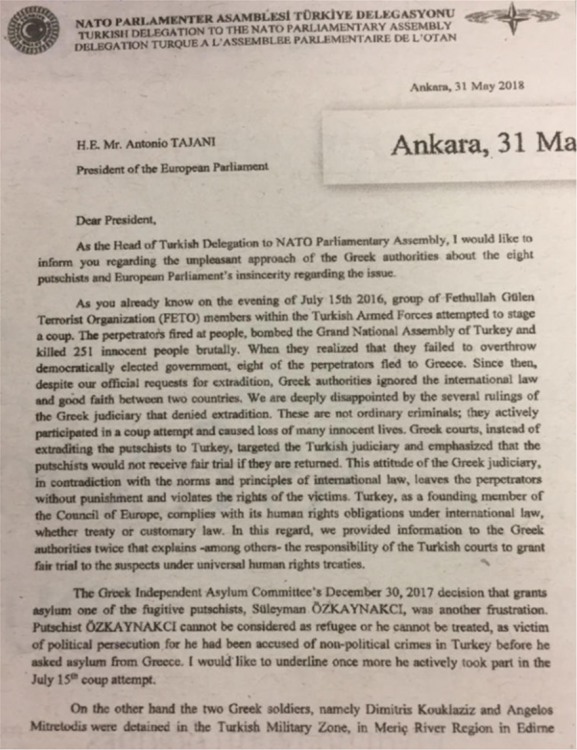 Αποστολέας της επιστολής είναι ο πρόεδρος της κοινοβουλευτικής επιτροπής της Τουρκίας στο ΝΑΤΟ, Αχμέτ Μπεράτ Τζονκάρ, με ημερομηνία 31 Μαϊου.