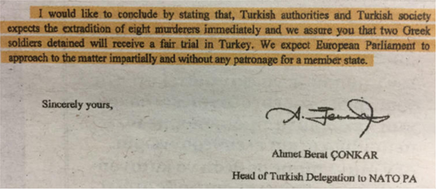 «Οι Αρχές της Τουρκίας και η τουρκική κοινωνία περιμένουν την έκδοση των οκτώ δολοφόνων άμεσα και σας διαβεβαιώνουμε ότι οι δύο κρατούμενοι Έλληνες στρατιώτες θα έχουν μια δίκαιη δίκη στη Τουρκία», αναφέρεται χαρακτηριστικά.