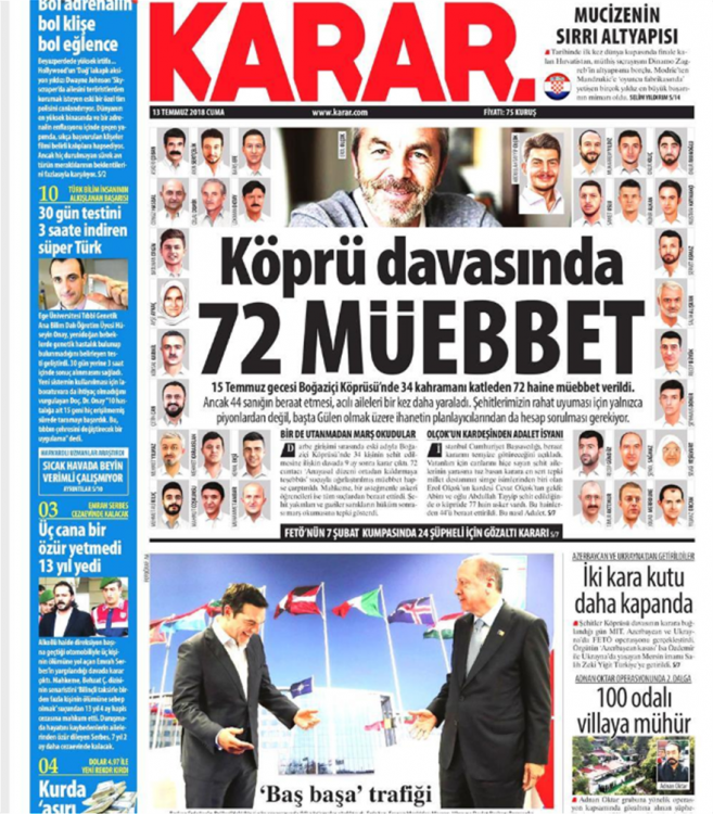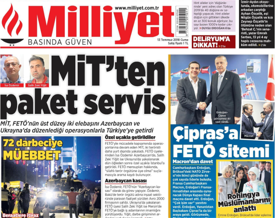 Εφημερίδα «Σαμπάχ»: Ο πρωθυπουργός της Ελλάδας Τσίπρας απέφυγε τον τουρκικό Τύπο, αναφέρει η εφημερίδα, εξηγώντας, ότι Τούρκοι δημοσιογράφοι προσπάθησαν να τον ρωτήσουν, αλλά εκείνος δέχτηκε ερωτήσεις μόνο από Έλληνες. Τέλος η εφημερίδα «Milliyet», αναφέρει στο εξώφυλλό της «Μομφή στον Τσίπρα για την FETO».