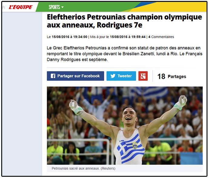 «Ο Έλληνας Λευτέρης Πετρούνιας κατέκτησε το χρυσό μετάλλιο στους κρίκους, μπροστά από τον κάτοχο του τίτλου, Αρτούρ Ζανέτι και τον Ρώσο, Ντένις Αμπλιάζιν. Ο 25χρονος Παγκόσμιος Πρωταθλητής συγκέντρωσε την πολύ καλή βαθμολογία των 16β. στους πρώτους του Ολυμπιακούς Αγώνες.