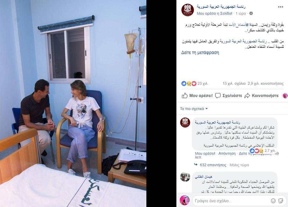 «Η Άσμα αλ-Άσαντ αρχίζει τον πρώτο κύκλο της θεραπείας για κακοήθη όγκο του μαστού ο οποίος ανακαλύφθηκε σε αρχικό στάδιο», αναφέρεται σε δήλωση που εκδόθηκε από τον λογαριασμό της προεδρίας στο Telegram.