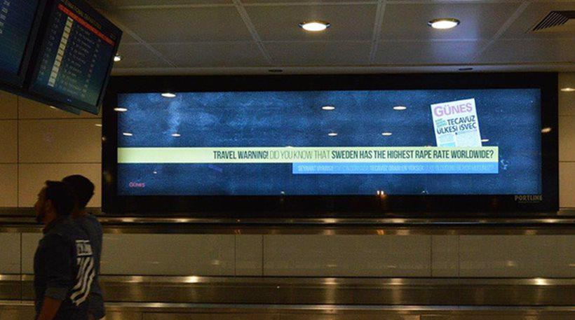 «Ταξιδιωτική προειδοποίηση: Ξέρετε πως η Σουηδία έχει το υψηλότερο ποσοστό βιασμών παγκοσμίως;», έγραφε η γιγαντοαφίσα που είχε τοποθετηθεί χθες κατά μήκος ενός κυλιόμενου διαδρόμου στο τμήμα αναχωρήσεων του διεθνούς τέρμιναλ του αεροδρομίου Ατατούρκ.